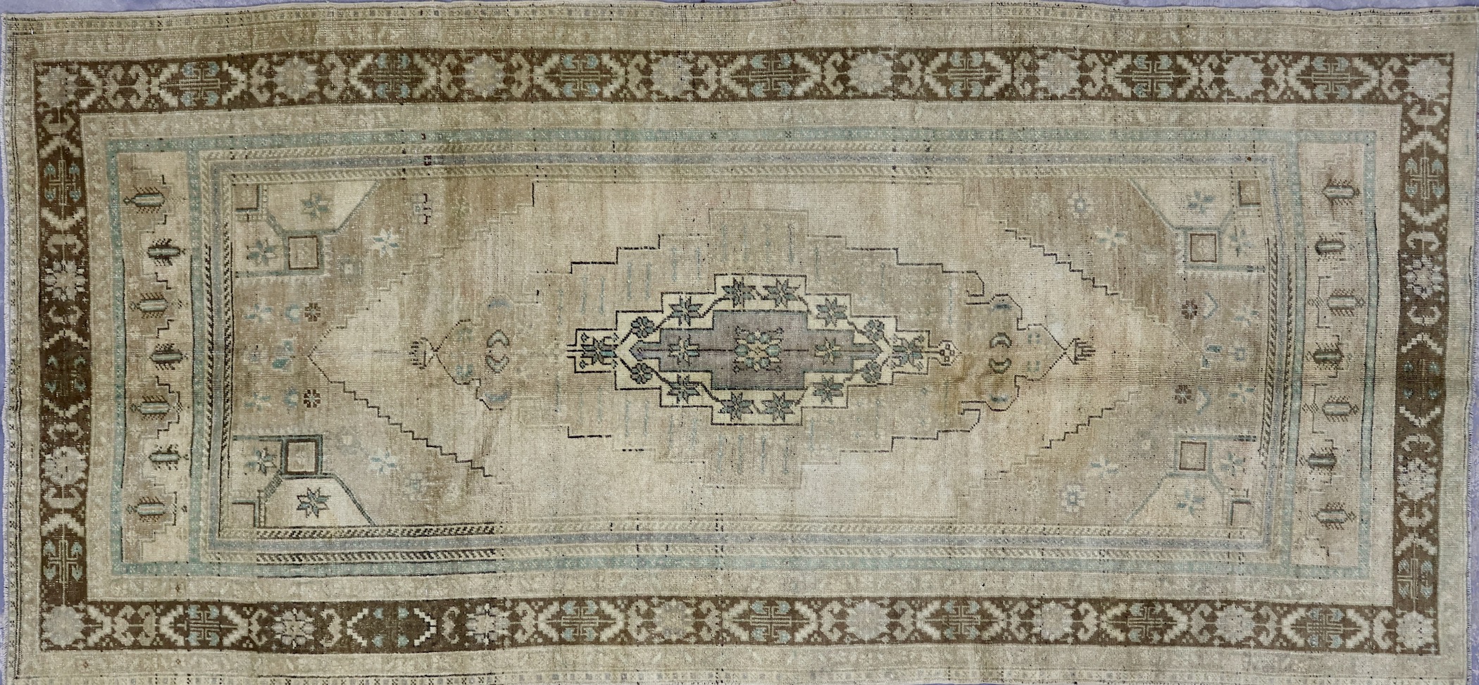 This reclaimed rug is a vintage piece from the small village of Taspinar in central Turkey. Located near to Konya, a province known for its rug production, the village has incorporated many weaving patterns and designs from the aforementioned city into its own creations–while still diverging to establish its own distinct style. Taspinar rugs are known for their intricate geometric and floral motifs, central medallions, rich colors derived from natural dyes and use of wool sourced local to the village. The rug has been washed in order to removed some of its dye to provide a more neutral color palette. As a result, this rug is both visually appealing and rich in cultural significance, making for a piece that is simply beautiful and unique.