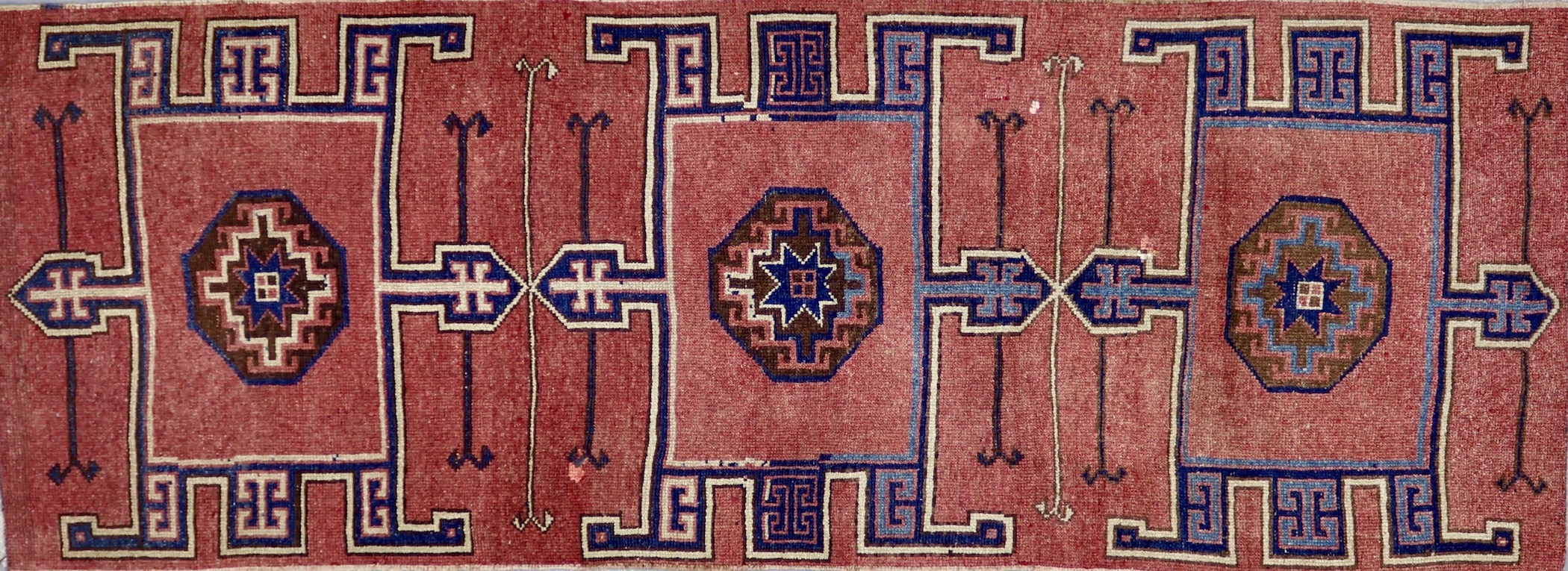 This runner is a vintage Kurdish Herki tribal runner from the Hakkari region of Southeastern Turkey. The craftsmanship of this piece is exquisite, as it is hand-knotted with handspun wool and dyed with natural root and floral pigments. This piece is rich in both aesthetic and cultural value, as these pieces come from a region wrought with political unrest and violence, thus making them widely unavailable to the rest of the world for many years.