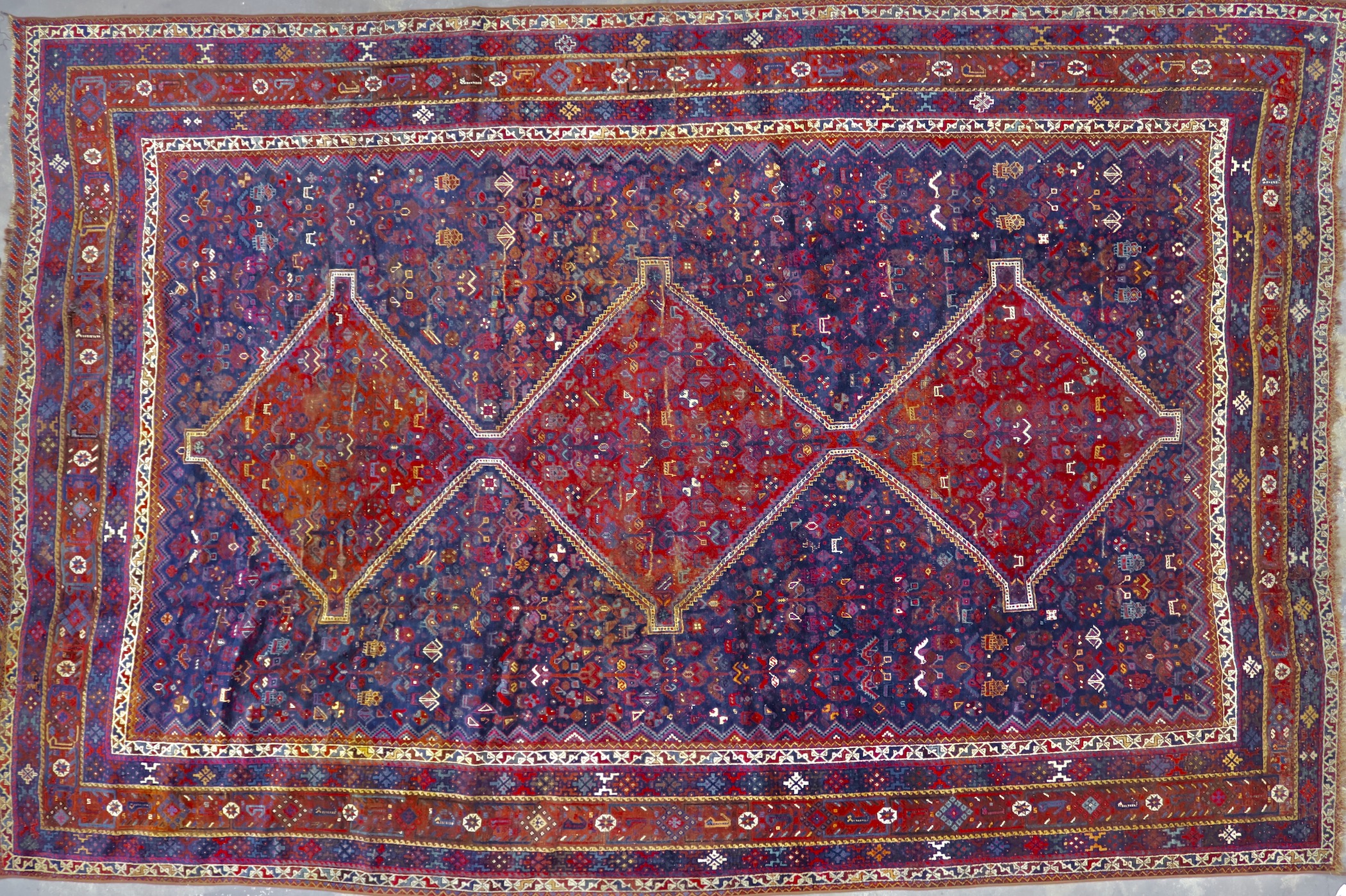 This rug is a vintage piece from 1950s Iran. Specifically, this piece was created in the city of Shiraz, an area known for its rug production with design influences from settled tribal weavers. Shiraz pieces are an amalgamation of the different methods, motifs, patterns and design elements that originated from varying tribes. In effect, this merging allows Shiraz pieces to stand alone as their own distinctive design style.