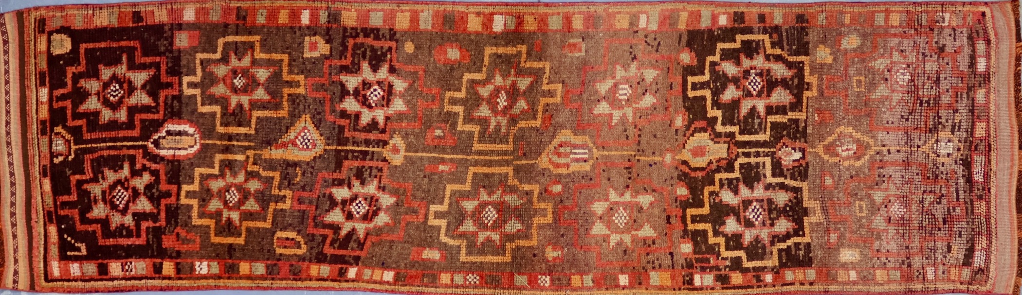 This runner is a vintage Kurdish Herki tribal runner from the Hakkari region of Southeastern Turkey. The craftsmanship of this piece is exquisite, as it is hand-knotted with handspun wool and dyed with natural root and floral pigments. This piece is rich in both aesthetic and cultural value, as these pieces come from a region wrought with political unrest and violence, thus making them widely unavailable to the rest of the world for many years.