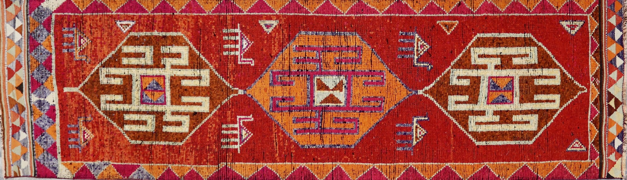 This runner is a vintage Kurdish Herki tribal runner from the Hakkari region of Southeastern Turkey. The craftsmanship of this piece is exquisite, as it is hand-knotted with handspun wool and dyed with natural root and floral pigments. This piece is rich in both aesthetic and cultural value, as these pieces come from a region wrought with political unrest and violence, thus making them widely unavailable to the rest of the world for many years.