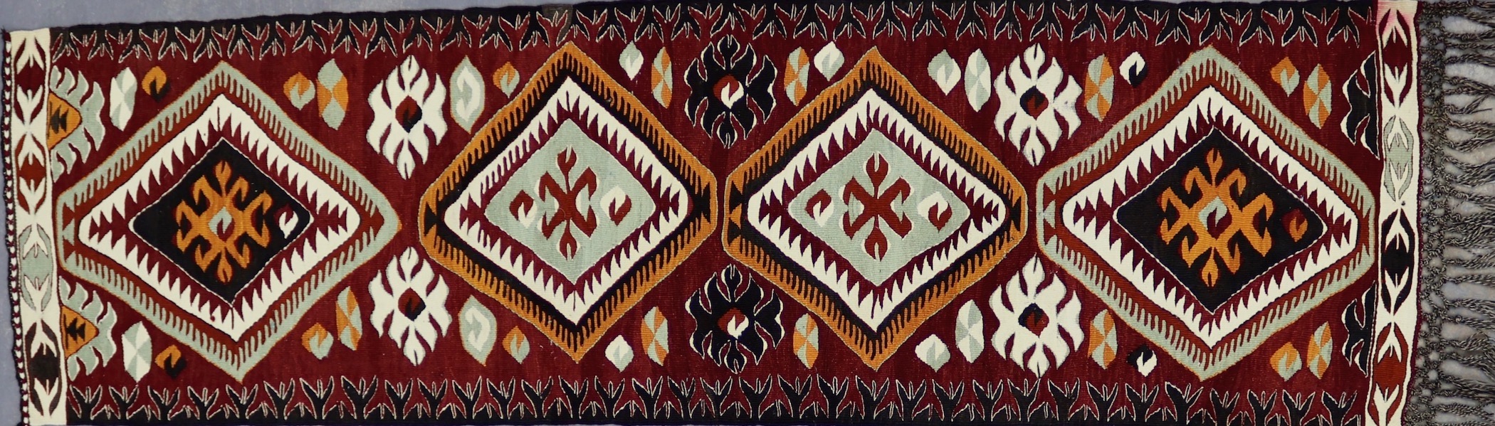 This runner is a vintage kilim piece from Turkey. Kilim weaving is a centuries-old technique that makes for flatweave, no-pile pieces that are both aesthetically appealing and functional. Traditionally handmade in countries of the former Persian Empire, kilims are the basis of many different styles born from the region. This rug in particular is from the Mut region of Turkey, and was woven by the Yoruk tribes. Mut kilims are known for their symbolic geometric patterns that represent prosperity, protection and life's journey. Not only is this piece one of cultural significance, but it also excently crafted.