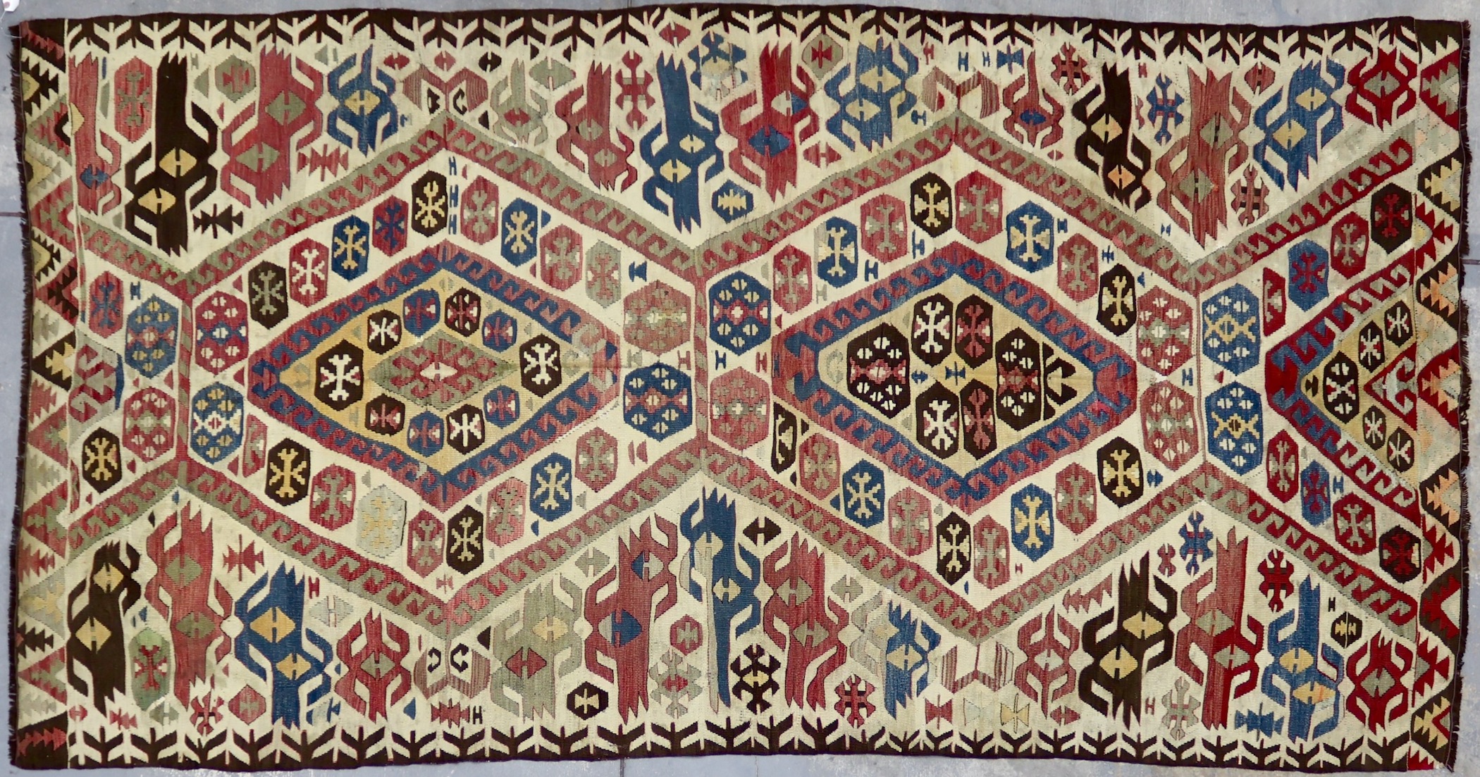 This kilim is an antique piece from Turkey. Kilim weaving is a centuries-old technique that makes for flatweave, no-pile pieces that are both aesthetically appealing and functional. Traditionally produced in countries of the former Persian Empire, kilims are the basis of many different styles born from the region. Woven in the 1910s this particular piece is from the Aydin region of Western Turkey. Expertly hand woven by the tribal and nomadic groups of the area, this piece is stunning in its craftsmanship, design and condition.