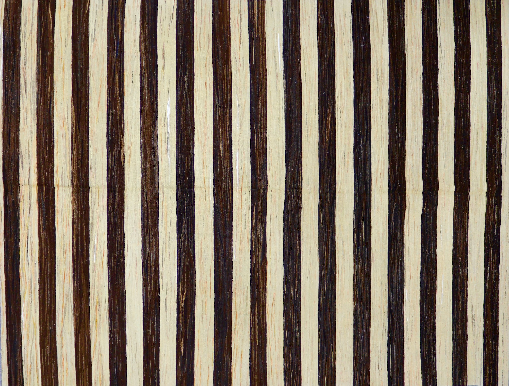 Kilim weaving is a centuries-old technique that makes for flatweave, no-pile pieces that are both aesthetically appealing and functional. Traditionally handmade in countries of the former Persian Empire, kilims are the basis of many different styles born from the region. This rug is particular is a recently made piece using vintage wool. While it has the look of vintage and antique Turkish kilims with its use of vintage fibers, it has the reliability of recently constructed pieces. This piece is also special in that there are varying colors throughout the distinct tan and brown sections, as the use of older, reclaimed wool entails less uniformity in appearance. Specifically, there are varying hues of tan and brown throughout each stripe, along with some hints of yellow and orange. These color variances only serve to make the piece more bespoke and unique.
