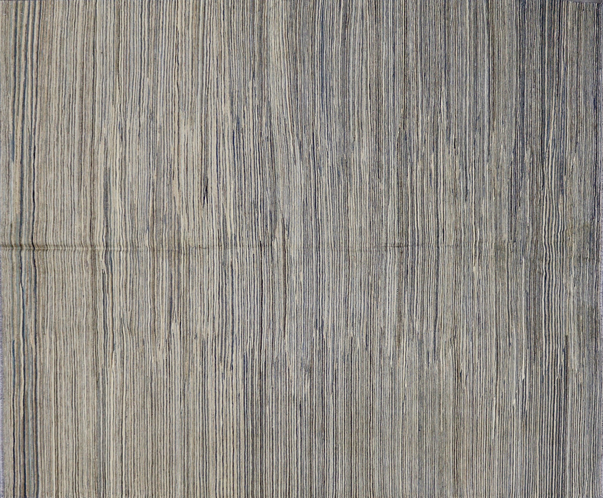 This rug is a new kilim piece from Pakistan. Kilim weaving is a centuries-old technique that makes for flatweave, no-pile pieces that are both aesthetically appealing and functional. Traditionally handmade in countries of the former Persian Empire, kilims are the basis of many different styles born from the region. Expertly hand-woven, this piece in particular has a minimalist, modern design aesthetic with its narrow striping in tan, light blue and grey. This piece perfectly combines the high craftsmanship of traditional rugs with the aesthetics of modern pieces.