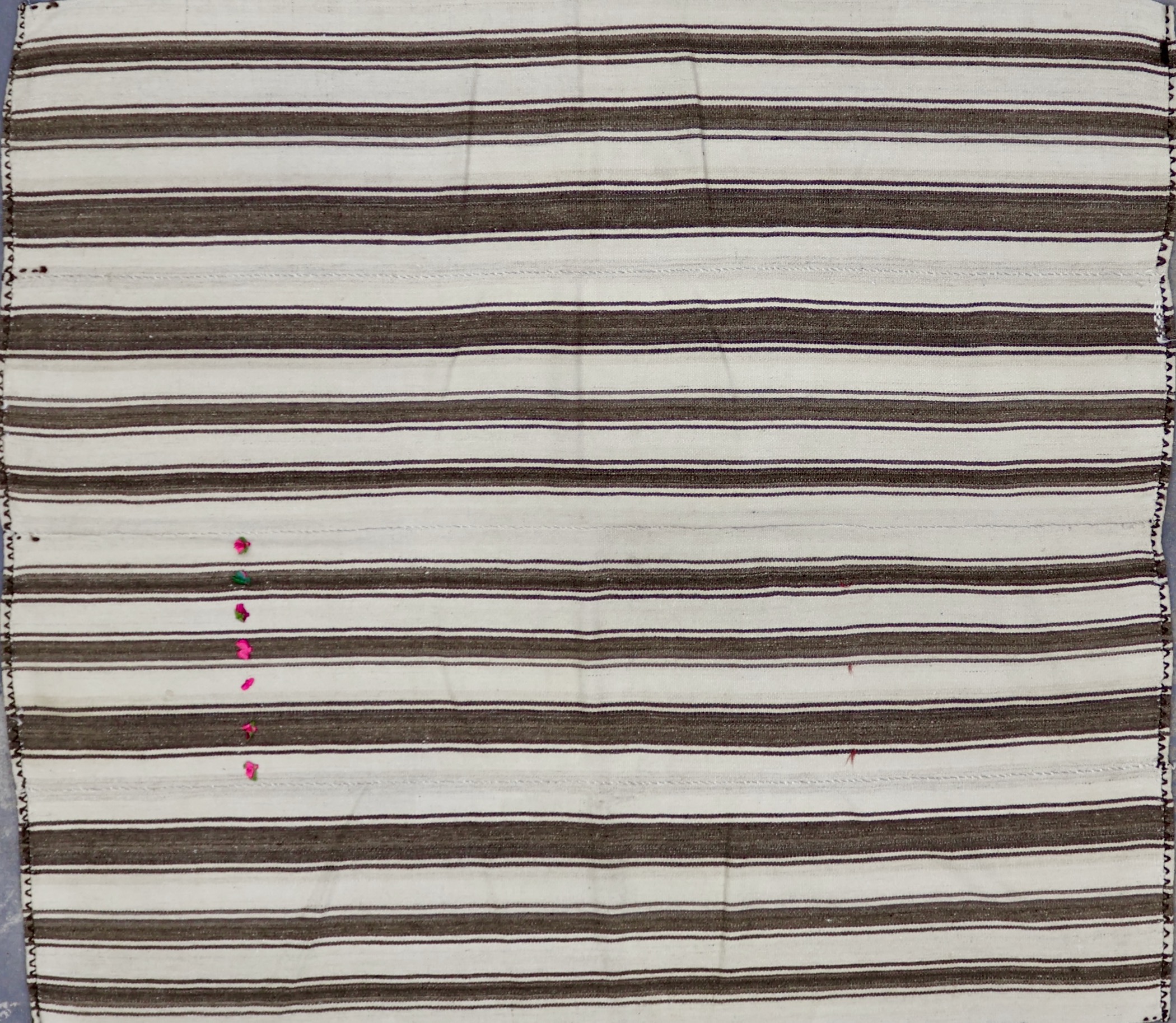 This rug is a vintage flatweave kilim piece from Turkey. Kilim weaving is a centuries-old technique that makes for flatweave, no-pile pieces that are both aesthetically appealing and functional. Traditionally handmade in countries of the former Persian Empire, kilims are the basis of many different styles born from the region. This piece in paticular is from the Konya region of Turkey, an area known for its craftsmanship of rugs and textiles. No dyes or chemicals were used in the construction of this piece, as it was originally used as a minimalist room divider, tent wall or floor covering. The high quality, all-natural appearance of the sheep wool makes for a very organically stunning piece.