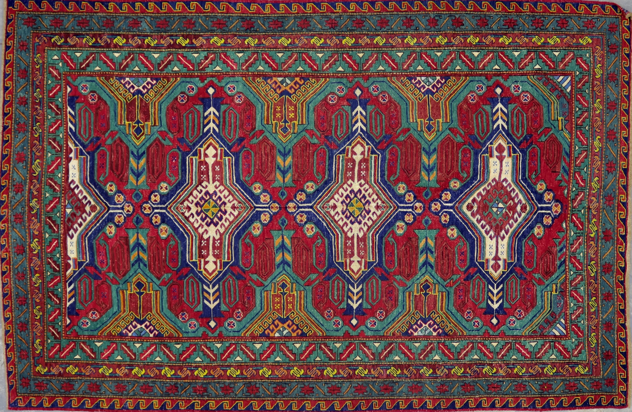 This vintage rug is a flatweave piece from the Caucasus. Hand-woven in the traditional Sumak style, this rug is strong and durable. Sumaks are known for their exquisite use of color, along with their geometric motifs and medallions – this piece is no exception, and it simply stunning.