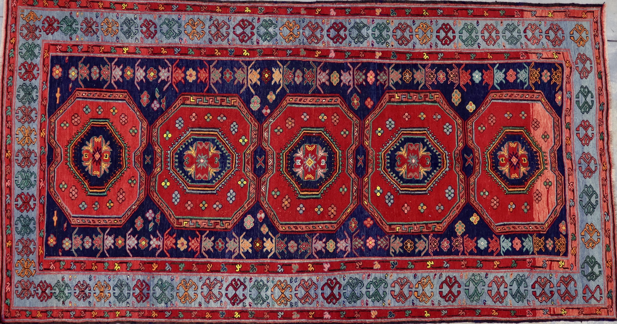 This vintage rug is a flatweave piece from the Caucasus. Hand-woven in the traditional Sumak style, this rug is strong and durable. Sumaks are known for their exquisite use of color, along with their geometric motifs and medallions – this piece is no exception, and it simply stunning.