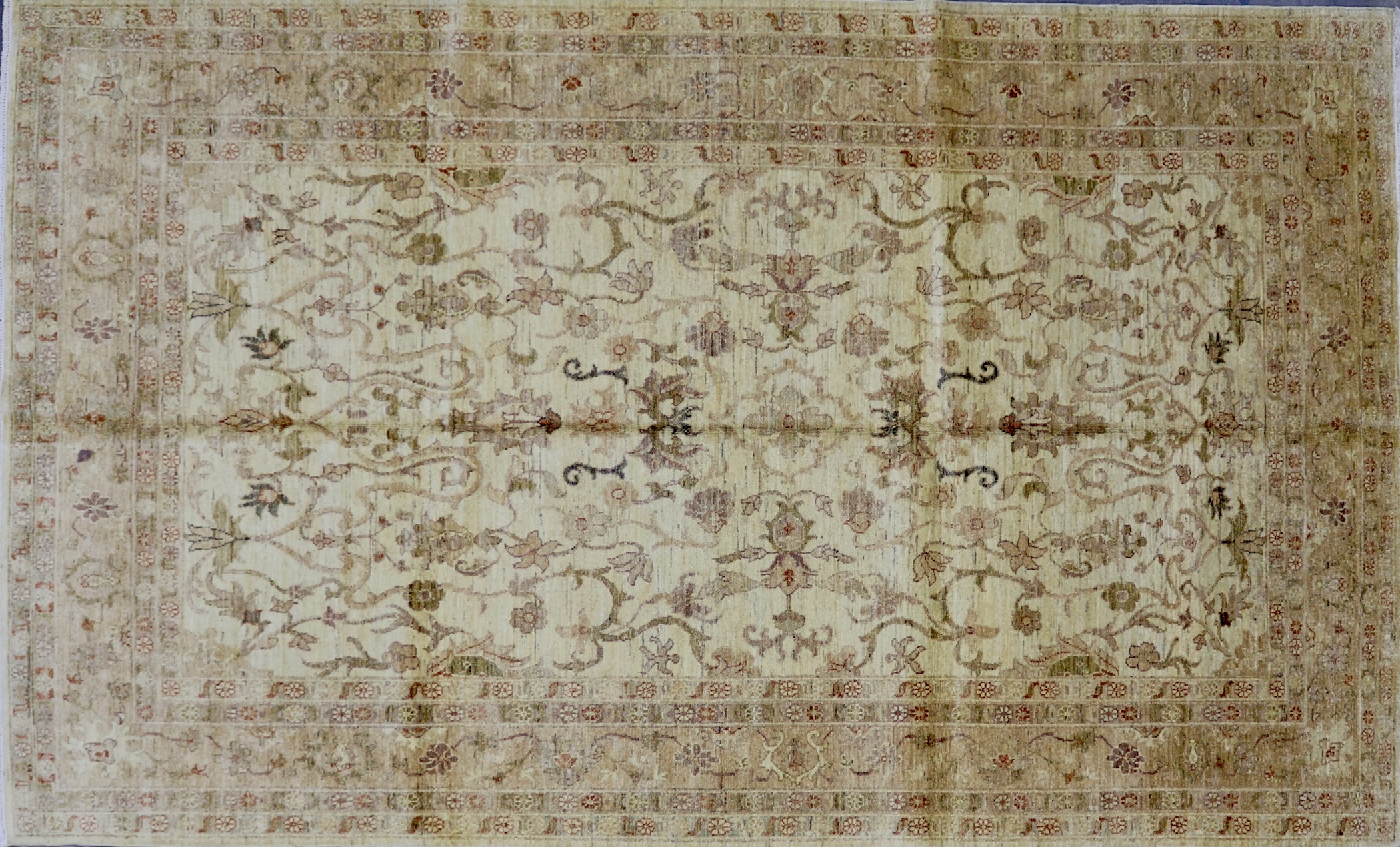Because of the size of our inventory, we are unable to keep rugs open and on display in store. Please note that slight shadows or differences in color may be shown in photographs due to how rugs are folded for storage. Any creases will surely fall out once the rug has been brushed and left open for a bit of time. We apologize for any inconsistency in appearance online.