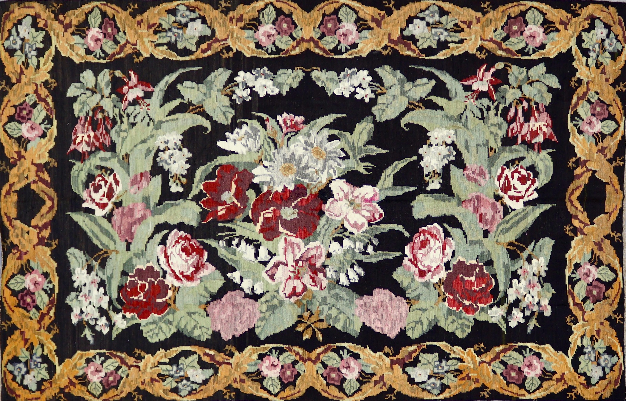 This rug is a vintage kilim from the 1980s. Kilim weaving is a centuries-old technique that makes for flatweave, no-pile pieces that are both aesthetically appealing and functional. Traditionally produced in countries of the former Persian Empire, kilims are the basis of many different styles born from the region. This piece in particular is a ornate floral piece from Moldova. Woven with hand-spun wool, all-natural dyes and adorned with a sweeping floral design, this piece is simply stunning. Moldovan rugs are renowned for their vibrant rose patterns set against a black background, making this specific rug a collectible piece of Eastern European folk art.